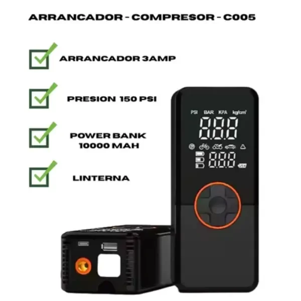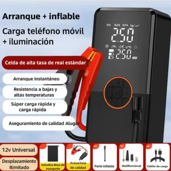 🔹 Funciones principales: arranca tu vehículo al instante, infla neumáticos, carga dispositivos móviles como un power bank y cuenta con linterna de emergencia.